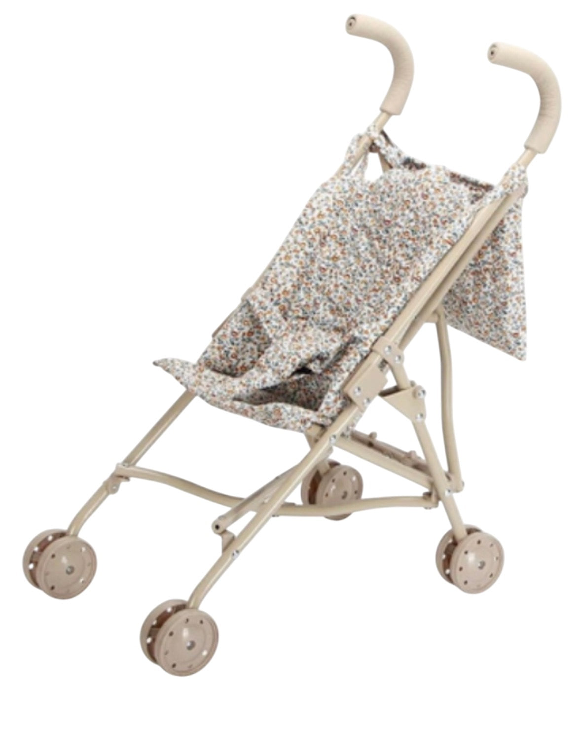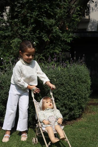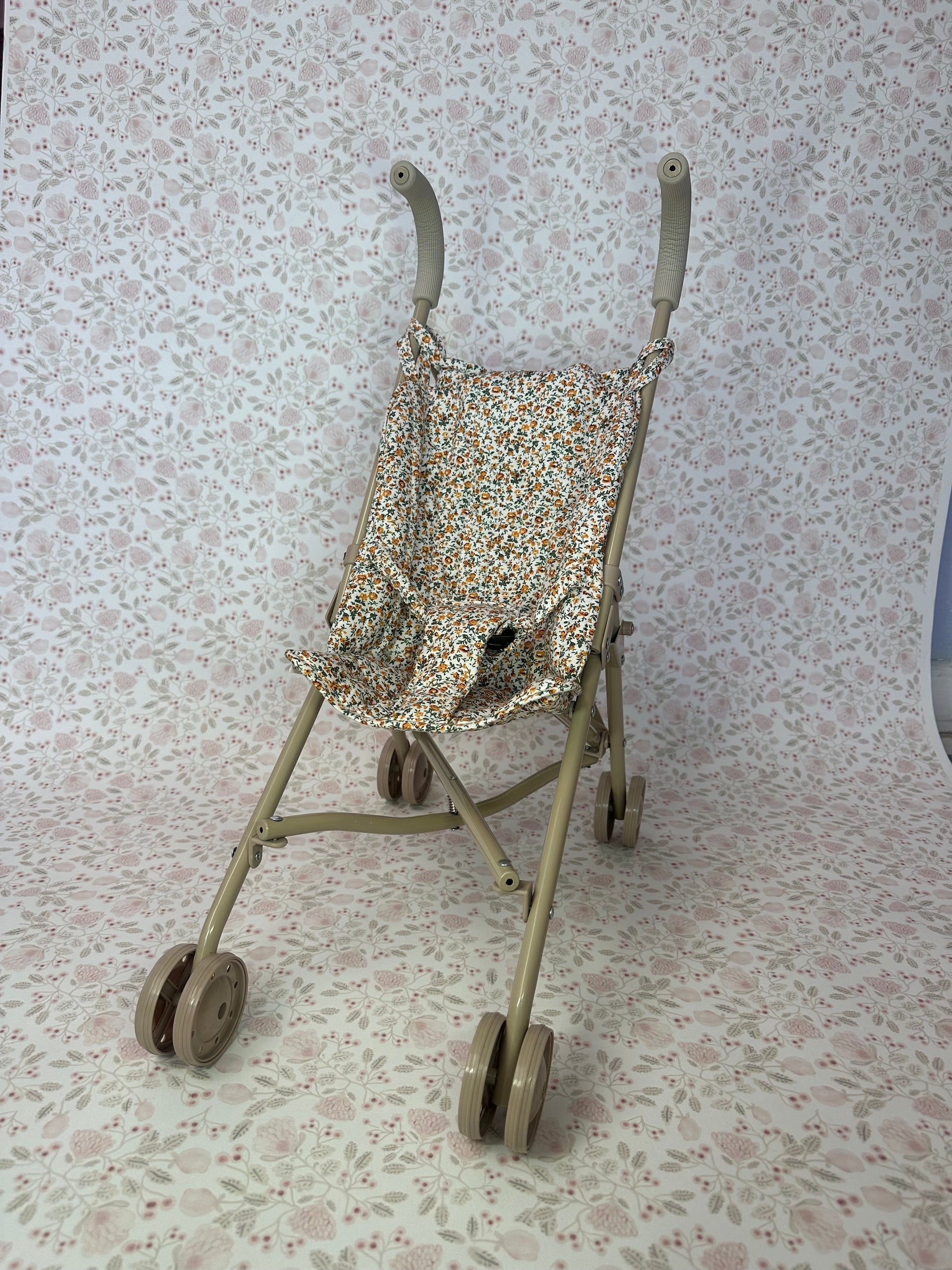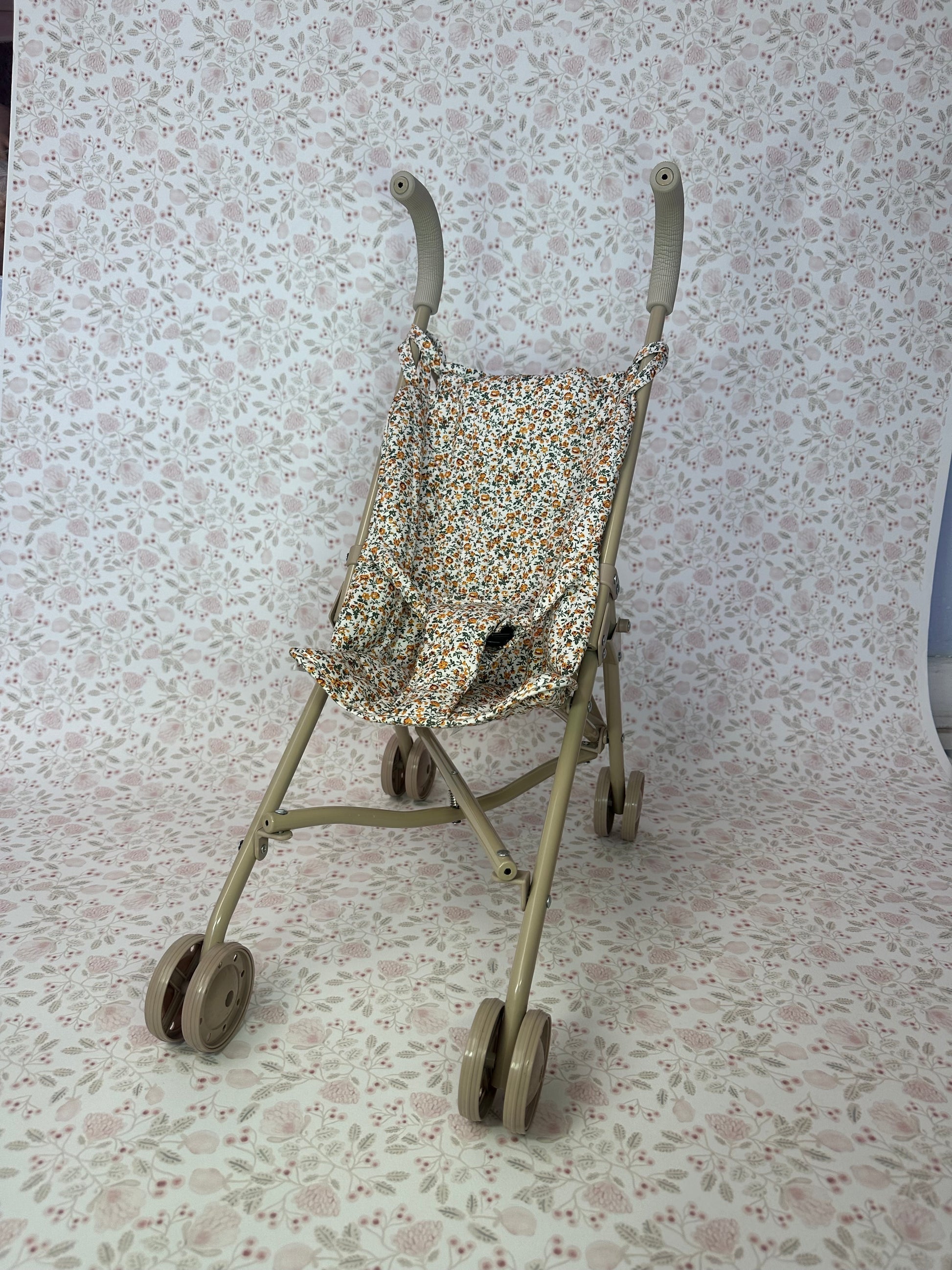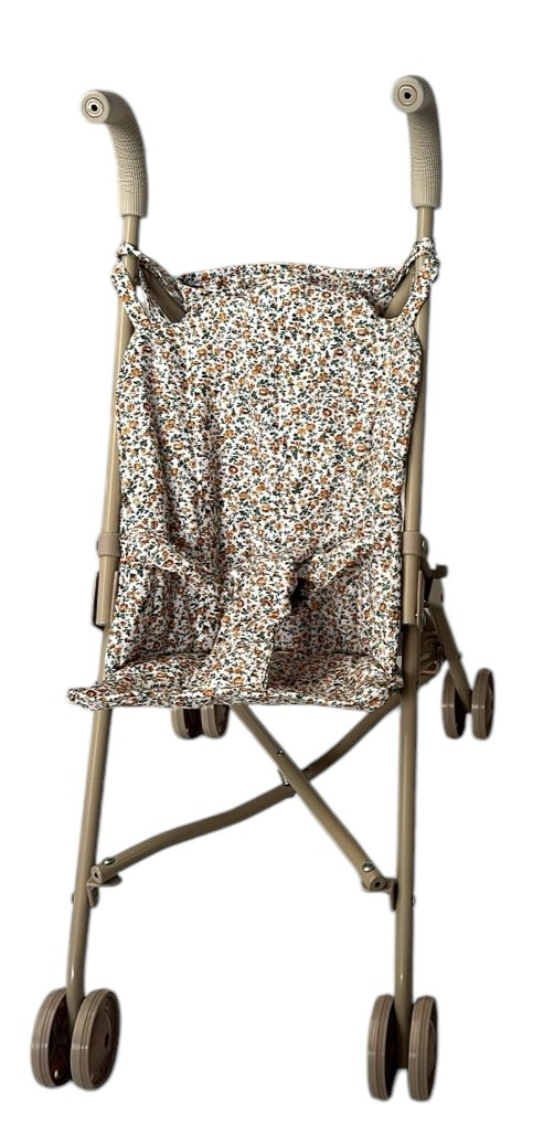 Carreolas fácil de doblar y ligera en la cual le podrán dar un paseo a su muñeca, tiene un estampado de flores y color neutro