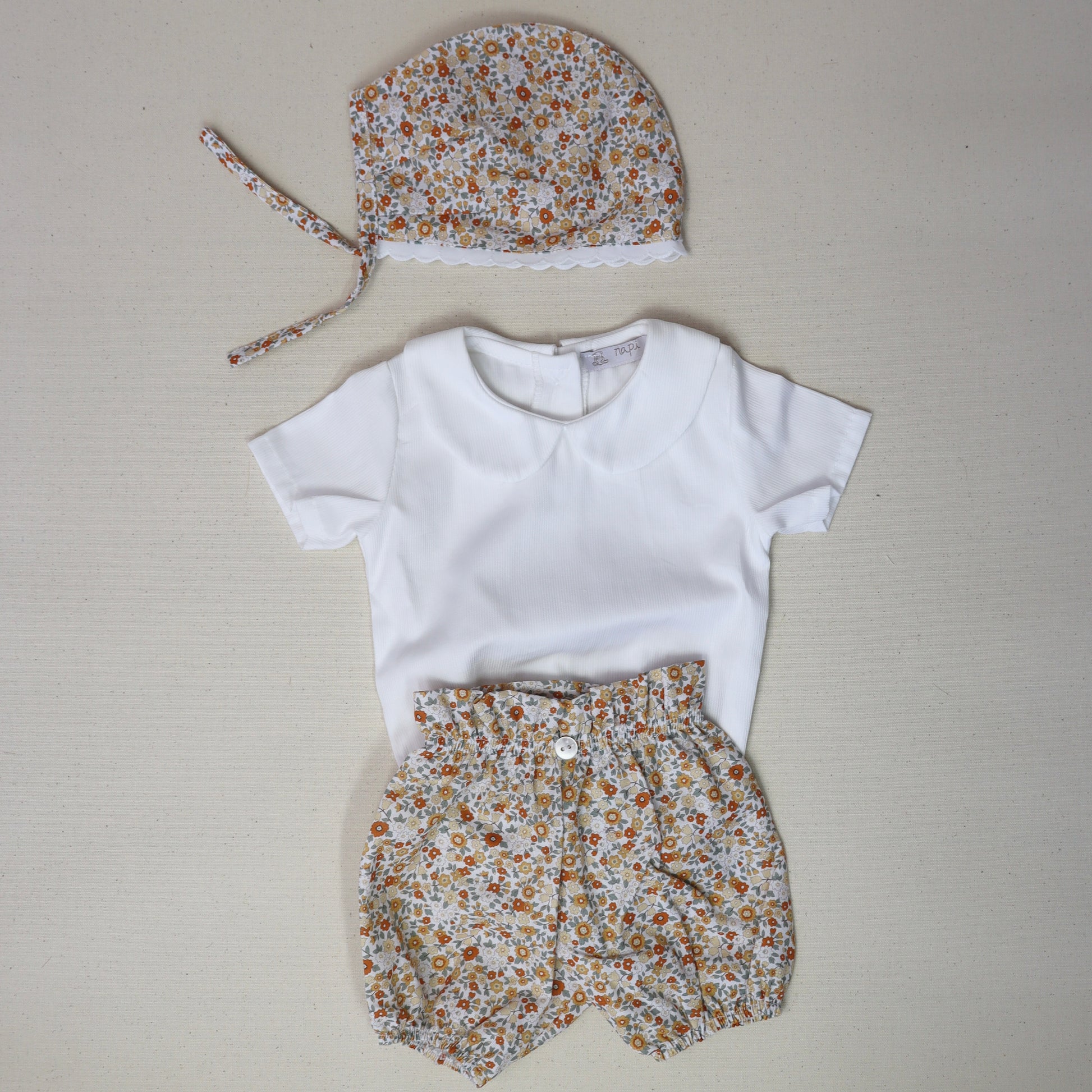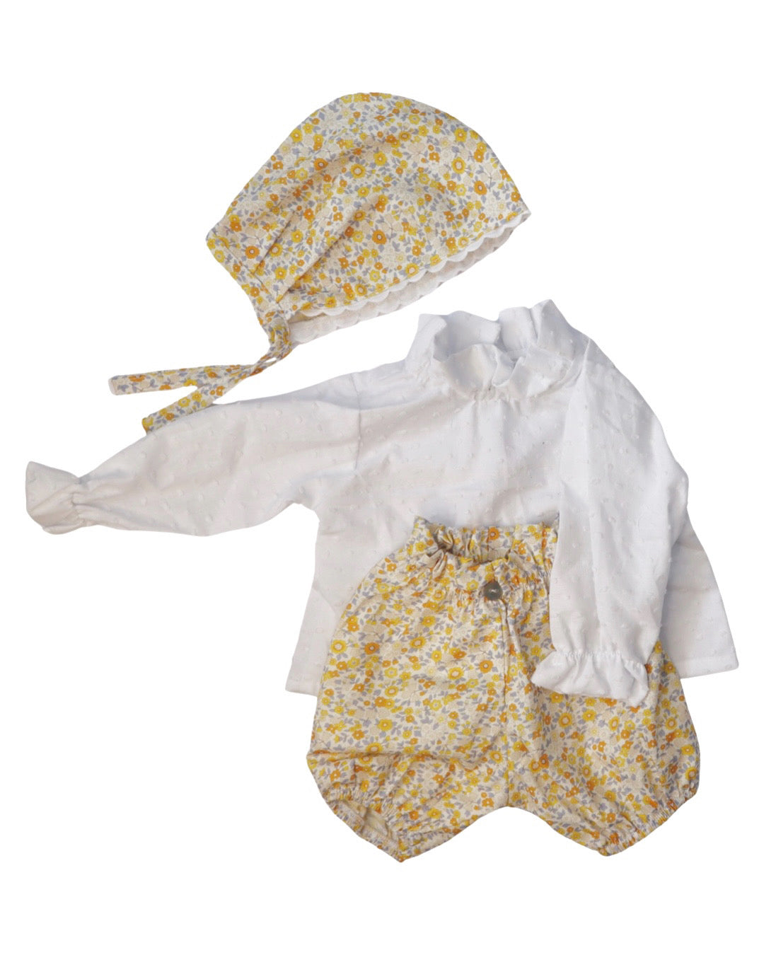 Viste a tu muñeca con un destello de sol y frescura. Nuestro conjunto de short y gorro en amarillo con flores es un tributo a la alegría de la temporada. Complementado con una camisa de baby cotton para la máxima suavidad, este conjunto es un paseo por un jardín de encanto y moda. Creado con esmero por nuestros artesanos mexicanos, este conjunto es la elección perfecta para que tu muñeca deslumbre con estilo en cada aventura de juego.