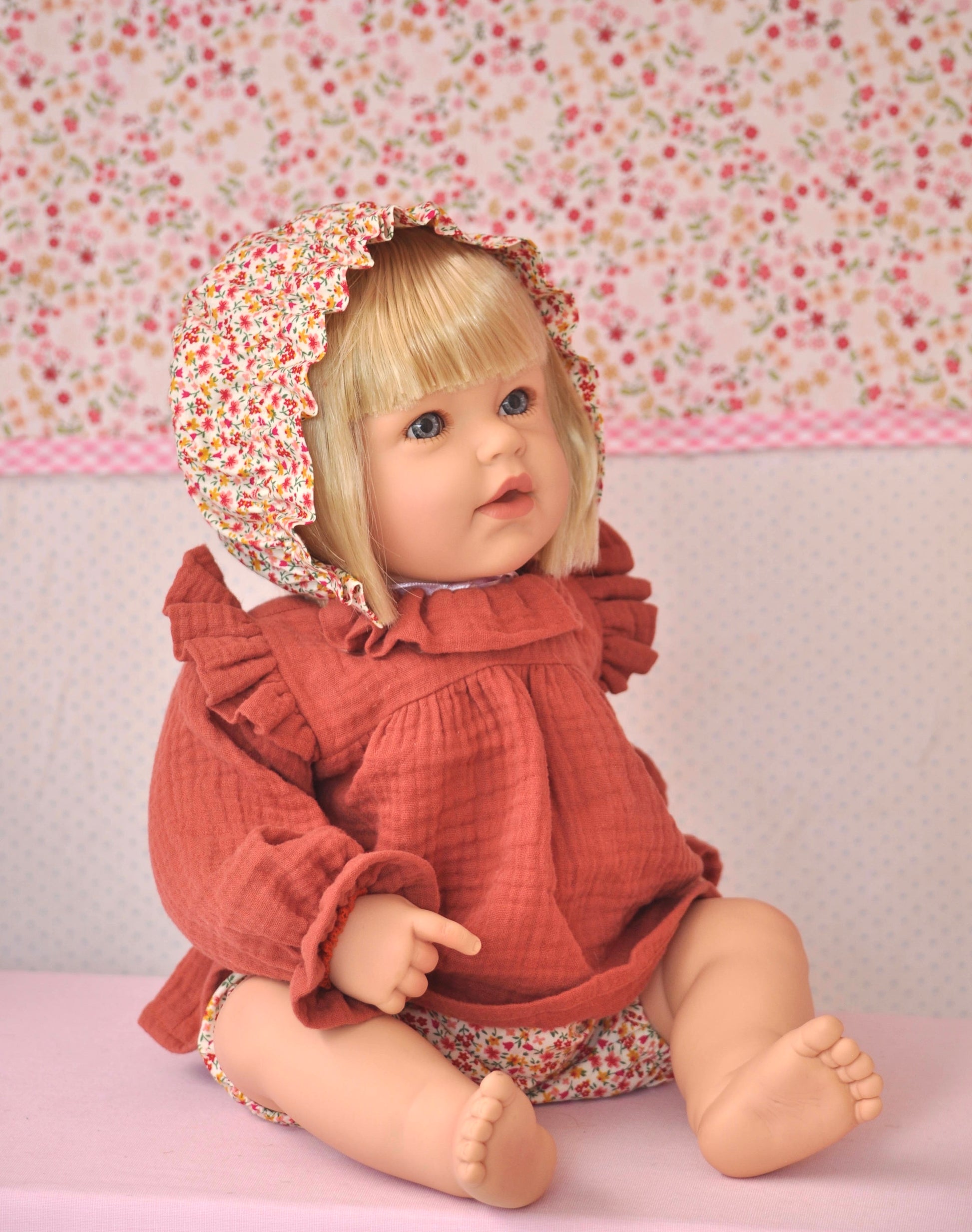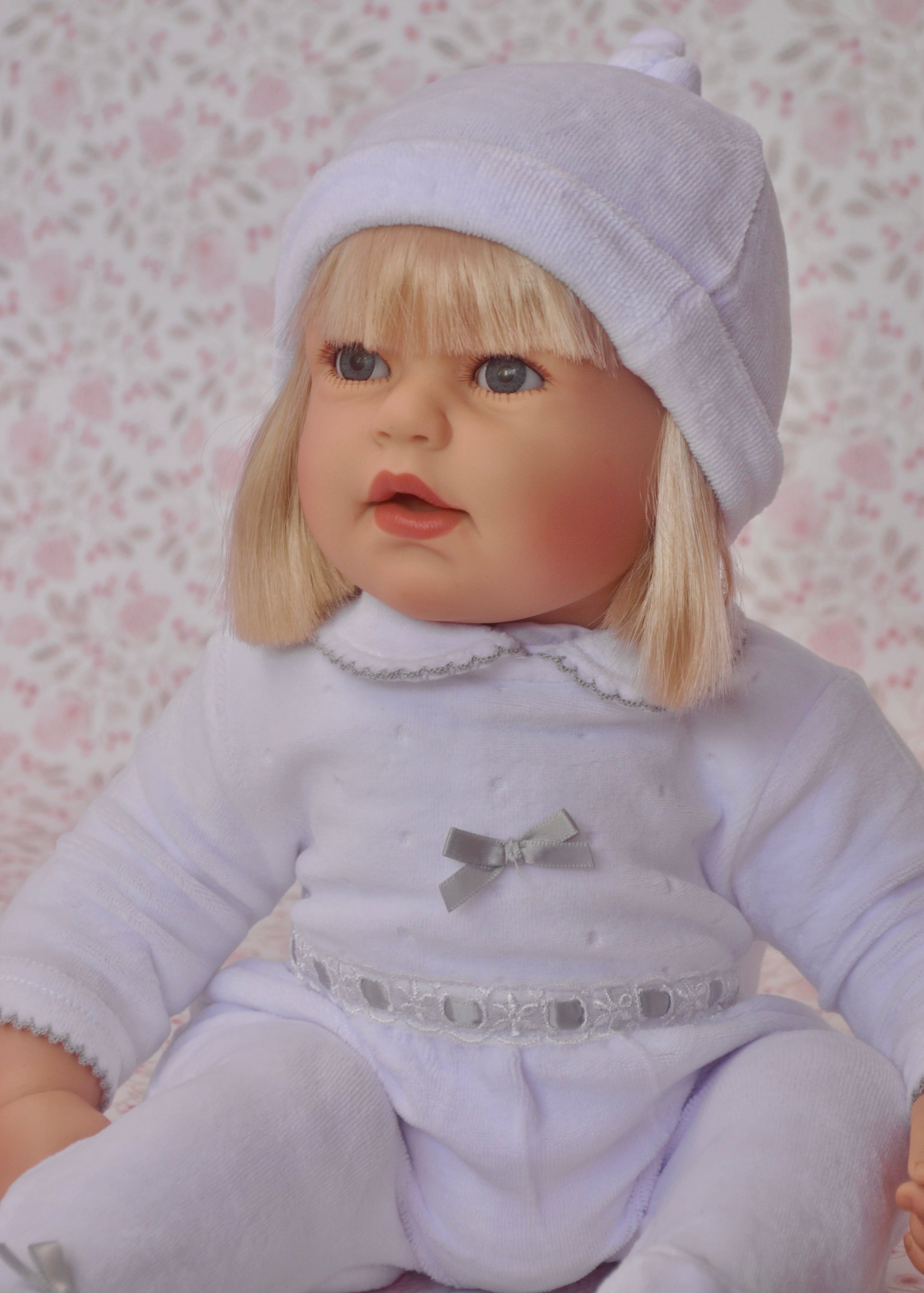El pelo rubio, con cuidadosos detalles y textura realista, complementan su apariencia, ofreciendo una representación única y encantadora, perfecta para niñas de 3 años en adelante, mide 54 cm, esta hecha de vinil con cuerpo blandito podrás sentir que estas cargando a un bebe recién nacido viene articulada y con un olor a bebe que te sorprenderá